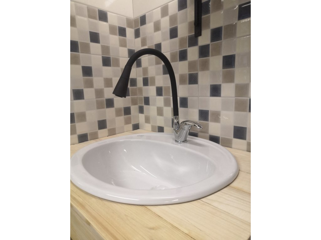Vodovodní baterie dřezová stojánková s flexibilním otočným ramínkem se sprchou.