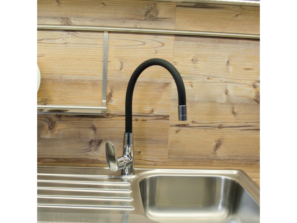 Vodovodní baterie dřezová stojánková s flexibilním otočným ramínkem.