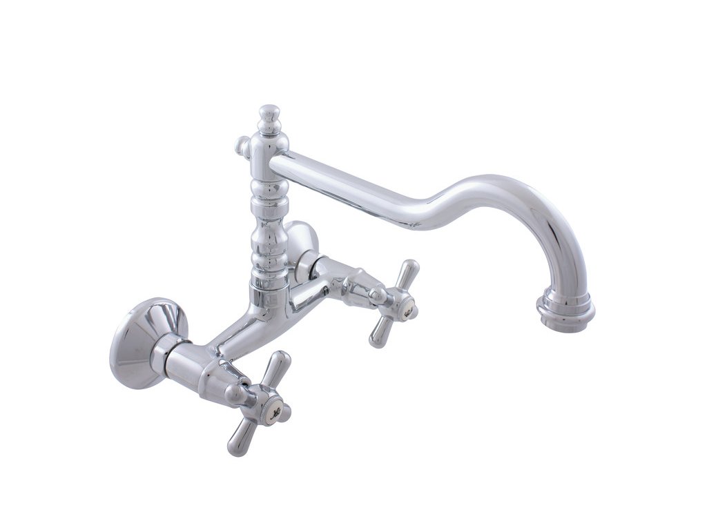 Vodovodní baterie dřezová nástěnná s kulatým otočným ramínkem.