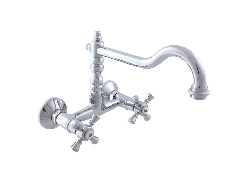 Vodovodní baterie dřezová nástěnná s kulatým otočným ramínkem.