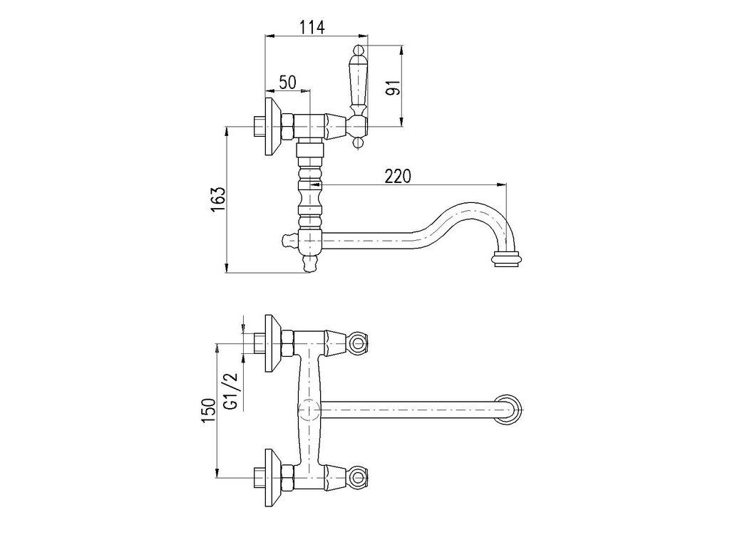 Vodovodní baterie dřezová/umyvadlová nástěnná s kulatým otočným ramínkem.