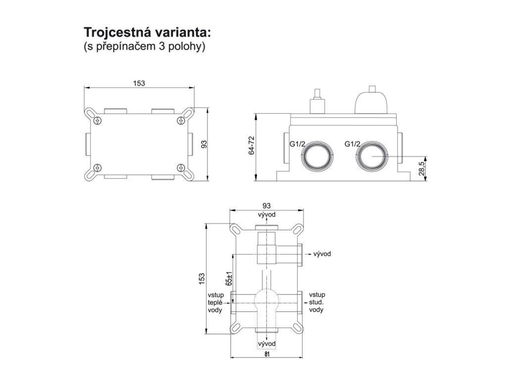 Tato sprchová podomítková baterie patří do řady vodovodních baterií Sonáta, která se vyznačuje robustním vzhledem a tichým chodem. Velmi kvalitní povrchová úprava a spolehlivost je samozřejmostí.Trojcestná varianta (s přepínačem 3 polohy) je určena do sprchových koutů s ruční sprchou, hlavovou sprchou a dalším zdrojem tekoucí vody, např. vodopádem.