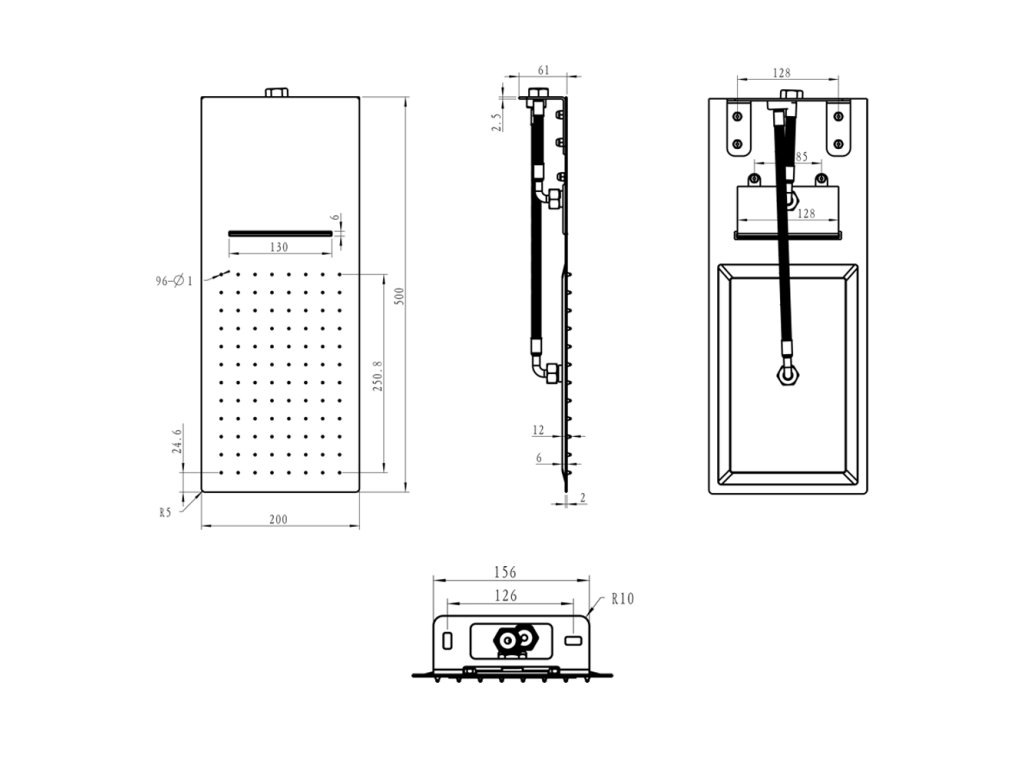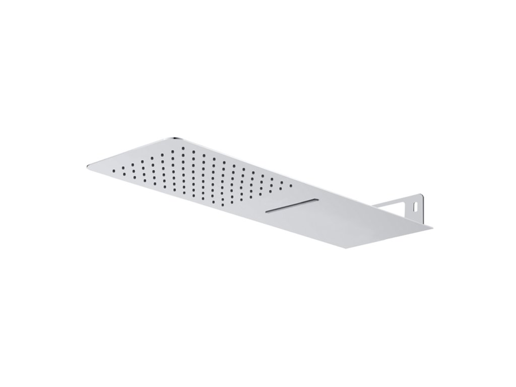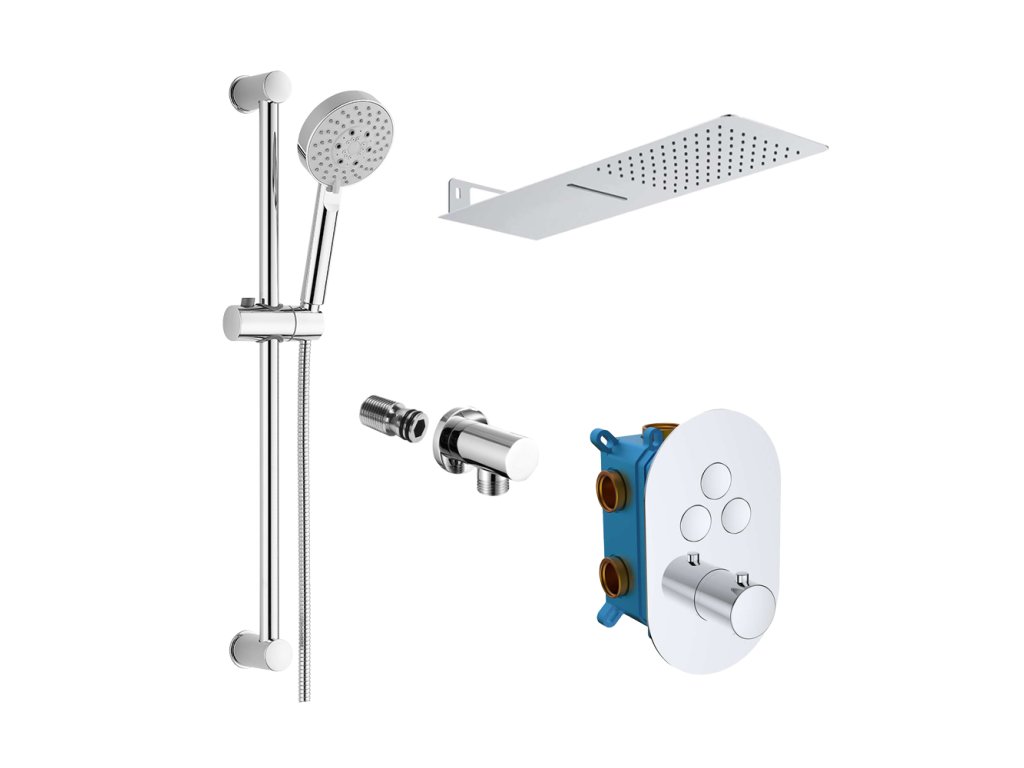 Součástí setu je talířová sprcha s vodopádem 500x200 mm, posuvný držák, pětipolohová sprcha, nerezová hadice se systémem zabraňujícim překroucení, 150 cm, stěnový vývod.