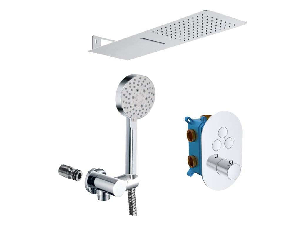 Součástí setu je talířová sprcha s vodopádem 500x200 mm, držák sprchy, pětipolohová sprcha, nerezová dvouzámková hadice 150 cm, stěnový vývod.