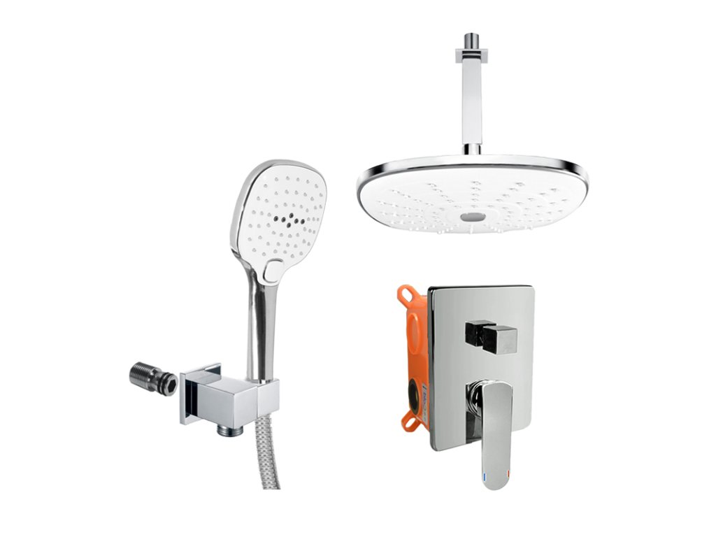 Dvoucestná podomítková baterie s keramickým přepínačem, Mbox, hranatý kryt, vývod s držákem sprchy, stropní rameno, talířová sprcha 240x240mm bílá/chrom, nerezová dvouzámková hadice 150 cm, třípolohová ruční sprcha.10 let záruka na baterii.