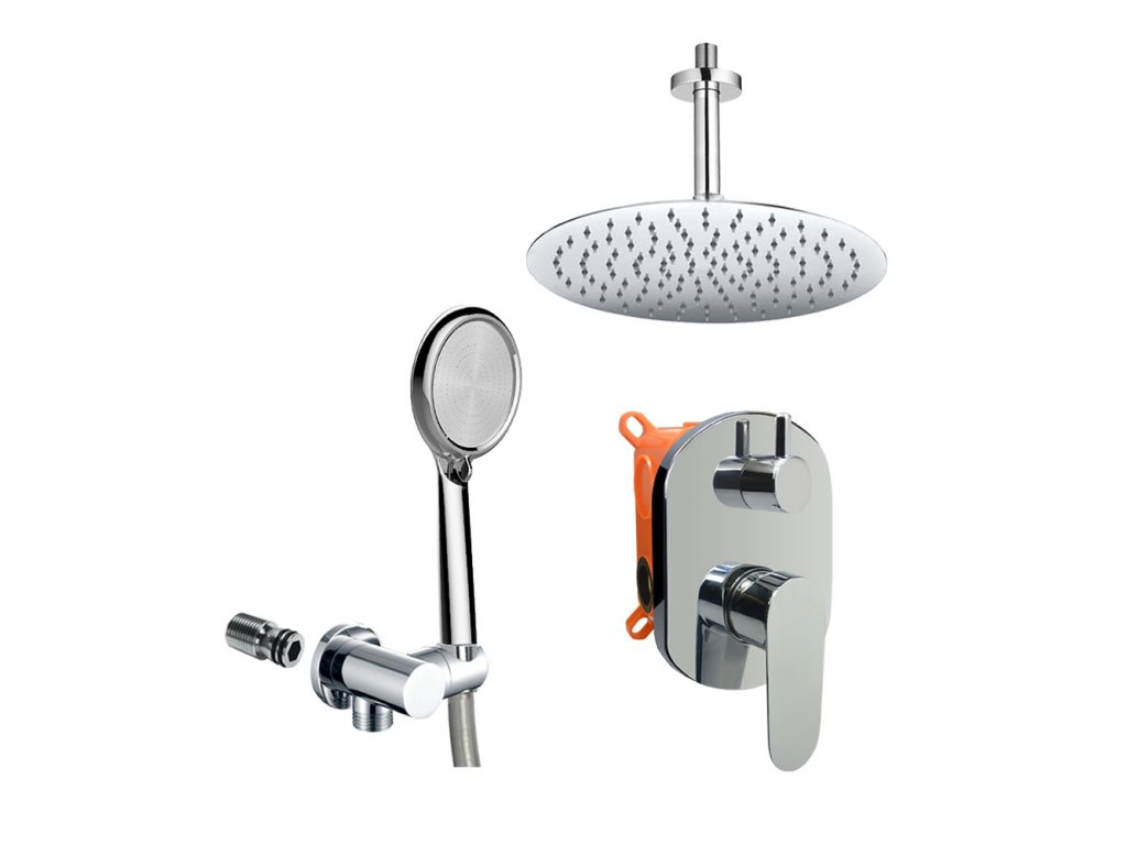Dvoucestná podomítková baterie s keramickým přepínačem, Mbox, oválný kryt, vývod s držákem sprchy, rameno ze stropu, nerezová talířová sprcha slim ø 300 mm, šedostříbrná hadice 150 cm, pětipolohová ruční sprcha.10 let záruka na baterii.