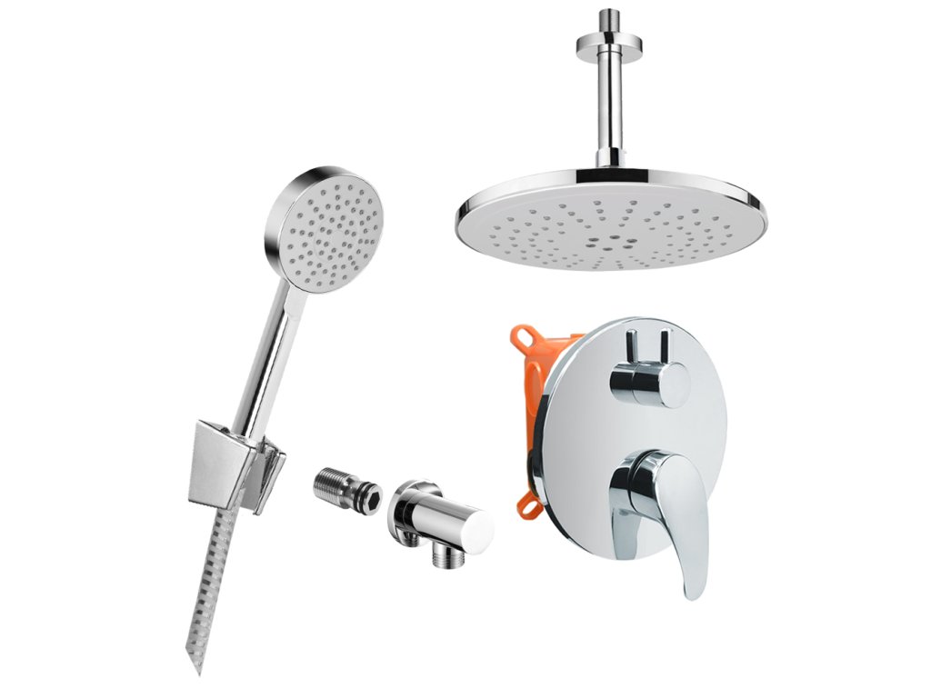 Dvoucestná podomítková baterie s keramickým přepínačem, Mbox, oválný kryt, vývod, stropní rameno, talířová sprcha ø 235 mm, držák sprchy, nerezová dvouzámková hadice 150 cm, jednopolohová ruční sprcha.10 let záruka na baterii.