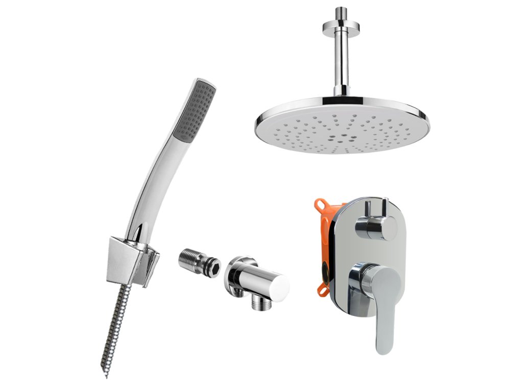 Dvoucestná podomítková baterie s keramickým přepínačem, Mbox, oválný kryt, vývod, stropní rameno, talířová sprcha ø 220 mm šedá/chrom, držák sprchy, spirálová hadice 150 cm, jednopolohová ruční sprcha.10 let záruka na baterii.
