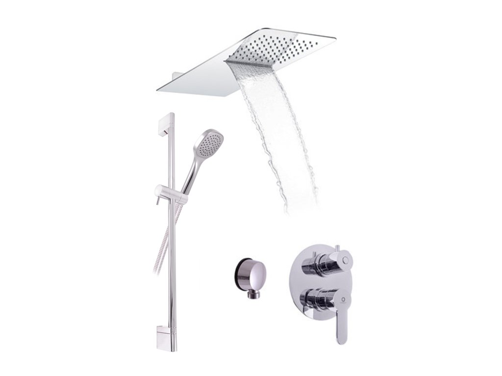 Sprchový komplet včetně vodovodní baterie s třícestným keramickým přepínačem, kompletem pro ruční sprchu a hlavovou sprchou s vodopádem.