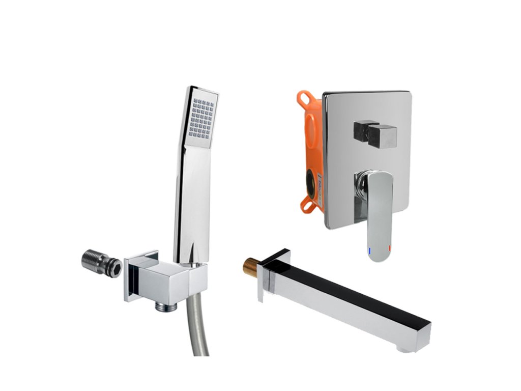 Dvoucestná podomítková baterie s keramickým přepínačem, Mbox, hranatý kryt, vývod s držákem sprchy, šedostříbrná hadice 150 cm, jednopolohová ruční sprcha, vanové napouštěcí ramínko.10 let záruka na baterii.