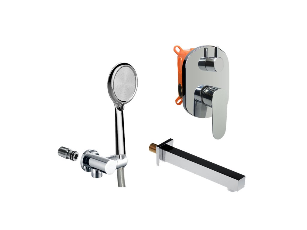 Vanový set s dvoucestnou podomítkovou baterií s přepínačem, Mbox, oválný kryt, jednopolohová ruční sprcha, plastová šedostříbrná hadice 150 cm, stěnový vývod s držákem, vanová výtoková hubice.10 let záruka na baterii.