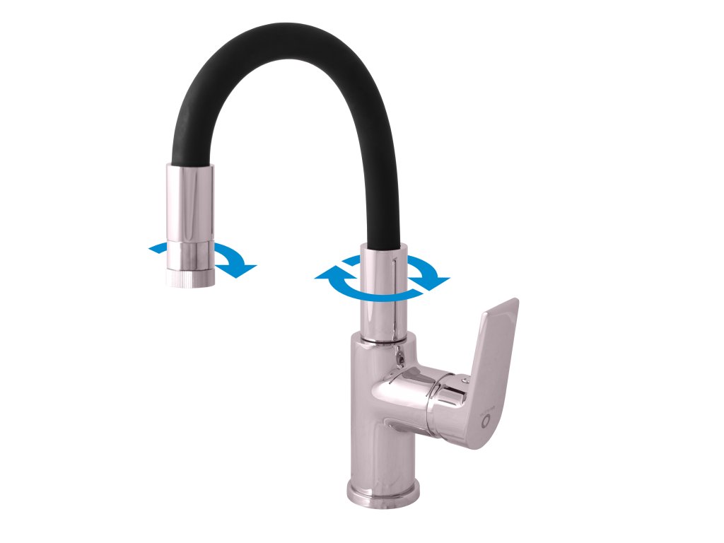 Vodovodní baterie umyvadlová stojánková s flexibilním otočným ramínkem s dvoupolohovým perlátorem.
