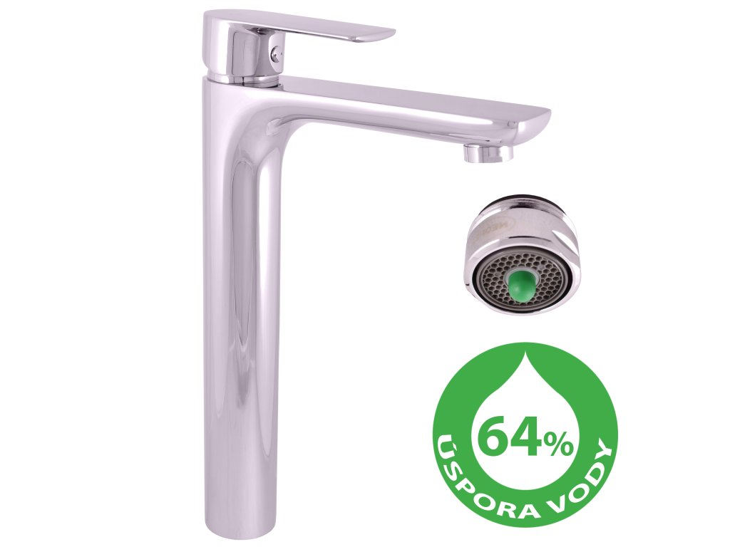 Spořící vodovodní baterie umyvadlová stojánková, vysoká pro umyvadla na desku.