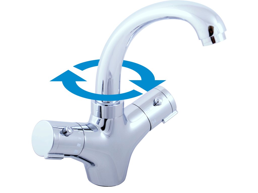 Vodovodní baterie umyvadlová stojánková termostatická bez otvírání odpadu.
