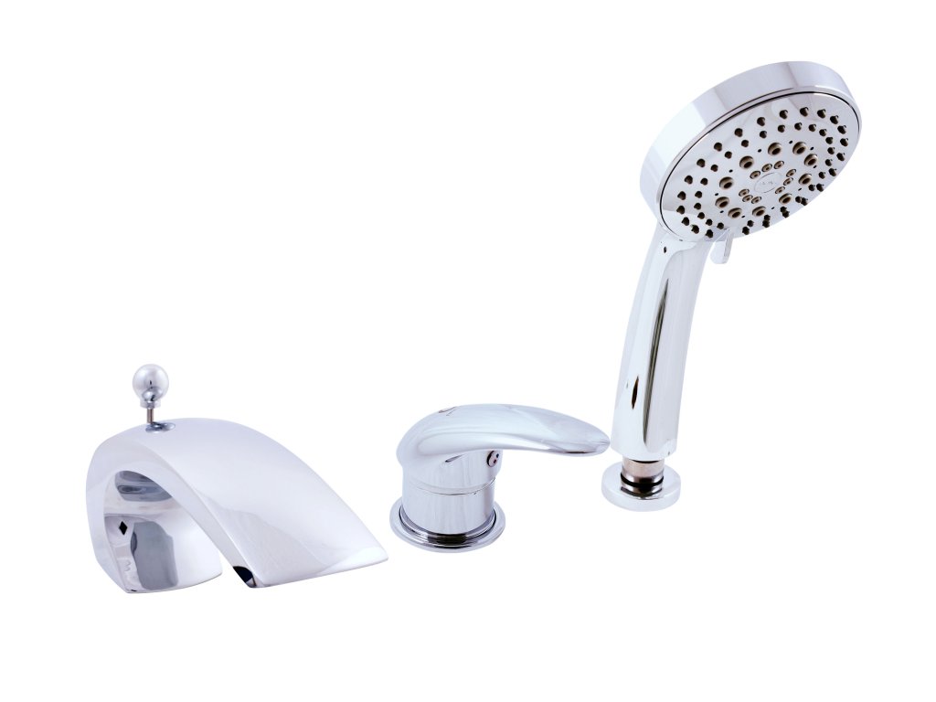 Vodovodní baterie vanová stojánková tříotvorová s přepínačem ve výtoku, samonavíjecí sprchou a 2m hadicí.