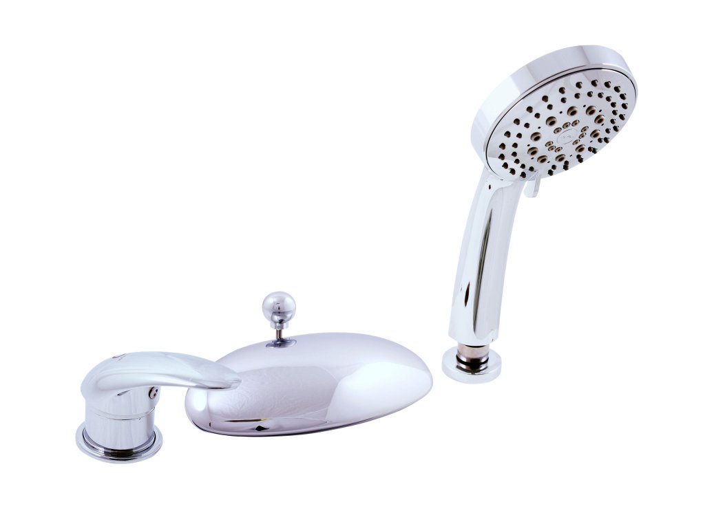 Vodovodní baterie vanová stojánková tříotvorová s přepínačem ve výtoku, samonavíjecí sprchou a 2m hadicí.