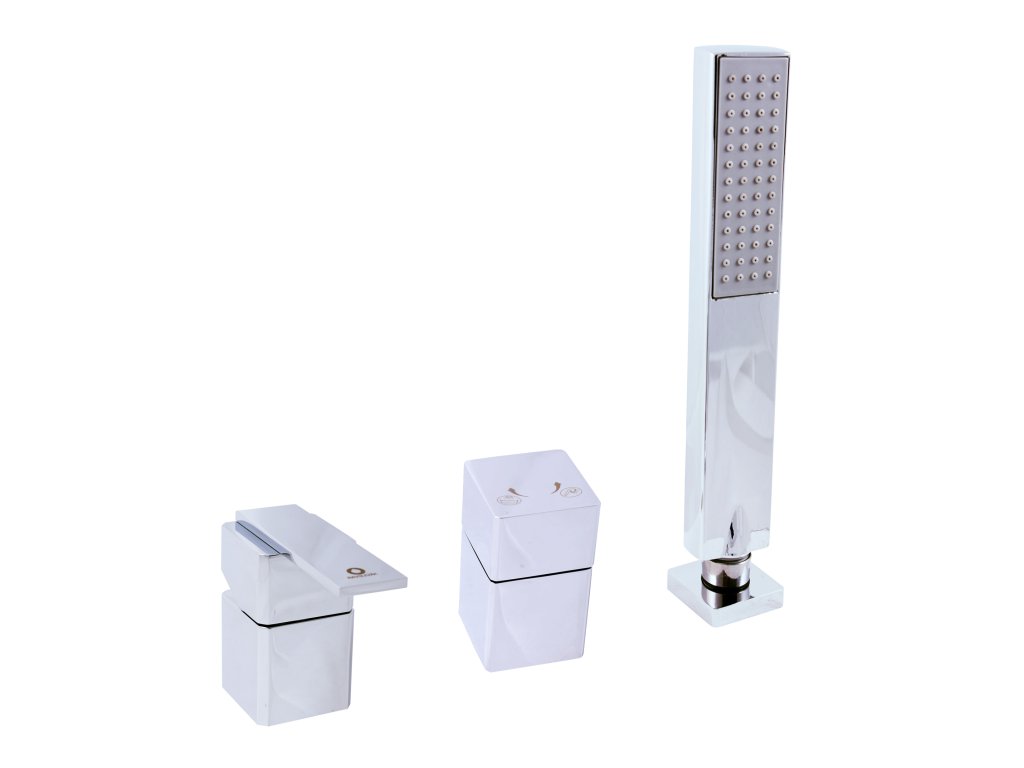 Vodovodní baterie vanová stojánková tříotvorová s keramickým přepínačem, samonavíjecí 2m hadicí a sprchou, pro napouštění přes přepad sifonu.