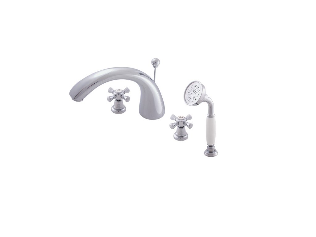 Vodovodní baterie vanová stojánková čtyřotvorová s přepínačem ve výtoku, samonavíjecí sprchou a 2m hadicí.
