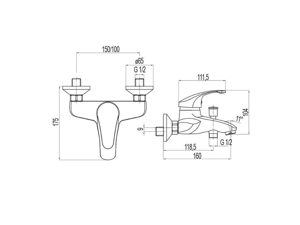 Mereo Vanová nástěnná baterie, Sonáta, 100 mm, bez příslušenství, chrom
