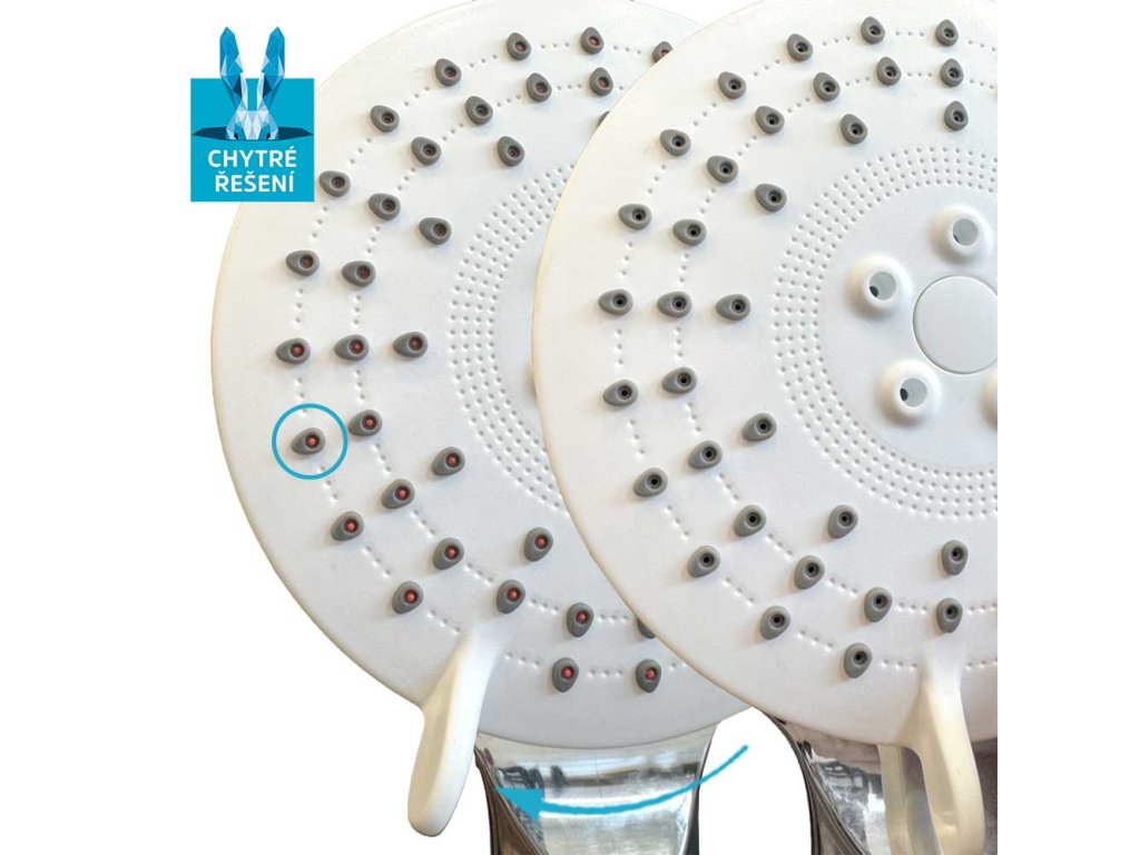 Třípolohová sprchová hlavice se vyznačuje moderním designem, vysokou variabilitou a především umožňuje téměř libovolnou kombinaci s příslušenstvím sprchového programu. Tato hlavice disponuje funkcí Push Clean pro ještě snadnější čištění. Funkce spočívá v tom, že páčku posunete do polohy vlevo a z trysek vyjedou červené tvrdé bodlinky, které vytlačí ven všechny usazeniny. Ty pak jednoduše spláchnete puštěním vody. Sprcha je osazena standardním závitem 1/2" pro připojení na sprchovou hadici.