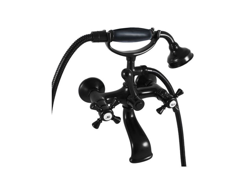 Vodovodní baterie vanová nástěnná s vidlicí na odkládání sprchy a se sprchou.