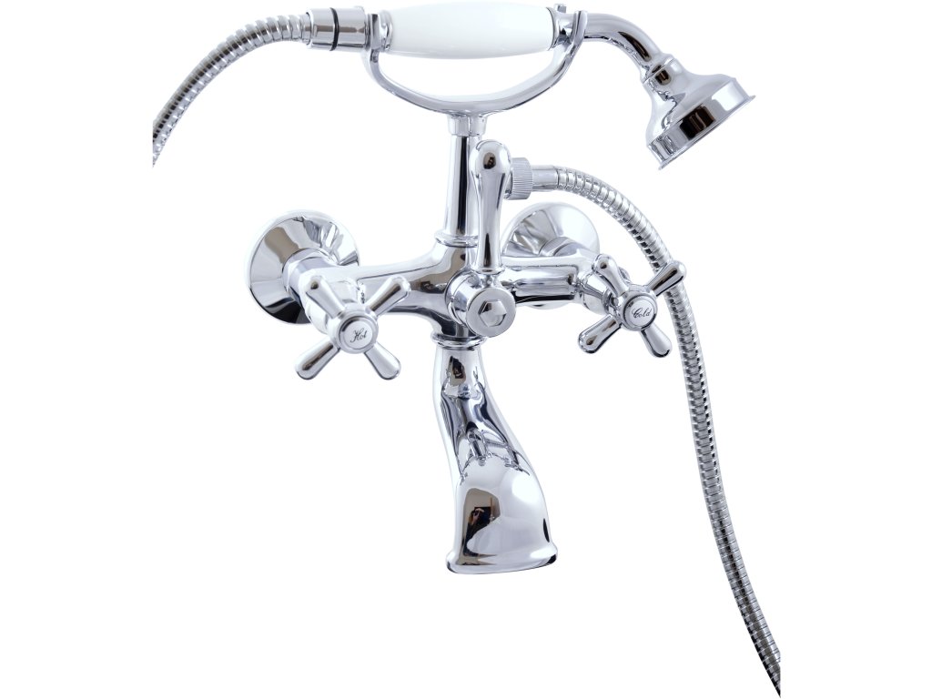 Vodovodní baterie vanová nástěnná s vidlicí na odkládání sprchy a se sprchou.